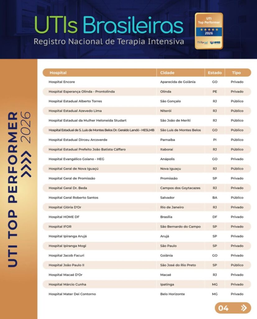 O selo Top Performer é concedido pela Epimed Solutions, em parceria com a Associação de Medicina Intensiva Brasileira, e é uma das distinções mais respeitadas da medicina intensiva no país. A certificação anual reconhece hospitais que apresentam excelência nos resultados clínicos, aliando qualidade assistencial à utilização eficiente de recursos em UTIs adultas.